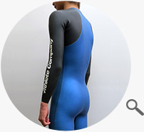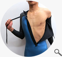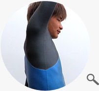 ボディー本体は、トライアスロン用ウェットスーツのために開発された素材、SCS(SuperConpositSkin)を使用。柔らかくよく伸 びトップスイマー並みのボディーポジションを確保する浮力があります。また、水中腕の流水抵抗値を極力押さえてくれるSCS加工が施されていま す。生地の厚みは標準5ミリ、浮力を抑えた3ミリよりチョイス。