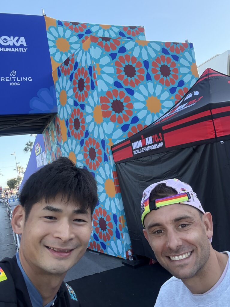トランジション終えた後に70.3世界チャンピオンのJelle Geens選手に遭遇!今年も圧巻の走りで2連覇を達成。一緒に写真撮って貰いました!