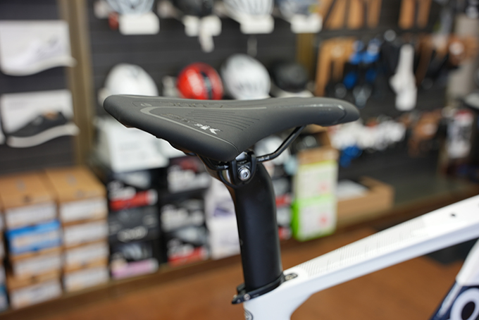 エアロポジションで乗りやすいセッテイングができるように、トライアスロン専用のフレーム設計を取り入れています。ヘッドチューブが短めの設計で、低いハンドルポジションから通常のハンドルポジションまで調整可能です。シートポスト部分は、81度に設計。体への負担が少ない前乗りのエアロフォームにセッテイング可能です。エアロポジションでの快適性、ランへの体力温存を考慮したバイク設計です。