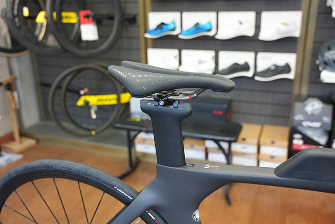 シートポストの台座を、前後に幅広く調整できます。体格に合わせて、サドルを適正位置に調整することができます。シートポスト後部についている土台には、ボトルゲージを取り付け可能です。エアロバー、ステルスボックス、リア台座、全て合わせてボトルを4本〜5本取り付け可能で、長時間のレースでもしっかりと水分補給できます。