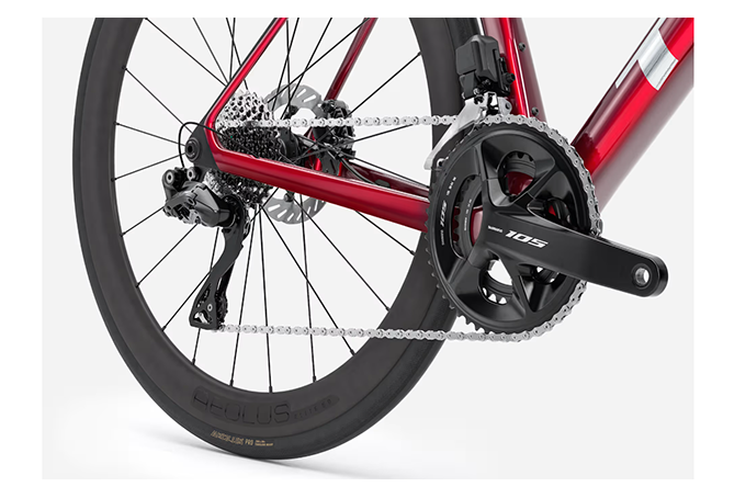 電動変速のシマノ 105 Di2が搭載されています。電動変速は、ボタン一つで簡単にストレスのない変速操作ができ、自然に変速回数が増えます。常に走りやすいギアにセットして走行でき、平坦から上り坂まで幅広く対応します。105パーツは、スポーツサイクリングからレースに対応したパーツグレードで、正確な変速と高いブレーキ性能を持ち、普段のトレーニングライド、レースまで幅広くご使用頂けます。